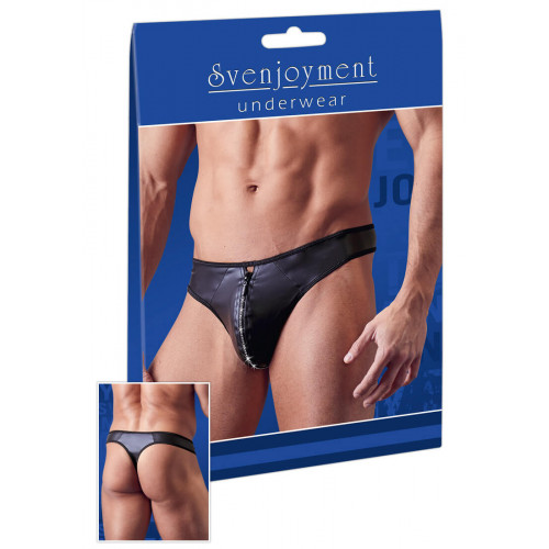 Мужские стринги черного цвета, сшитые из прочной ткани с полиуретановым покрытием. Модель классического кроя, спереди на самом пикантном месте декорированы молнией.