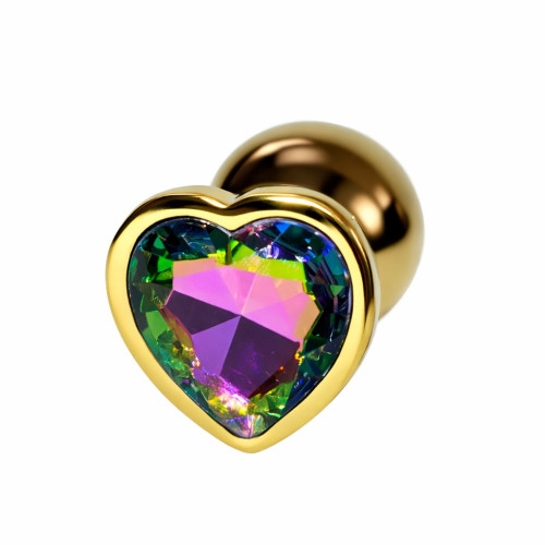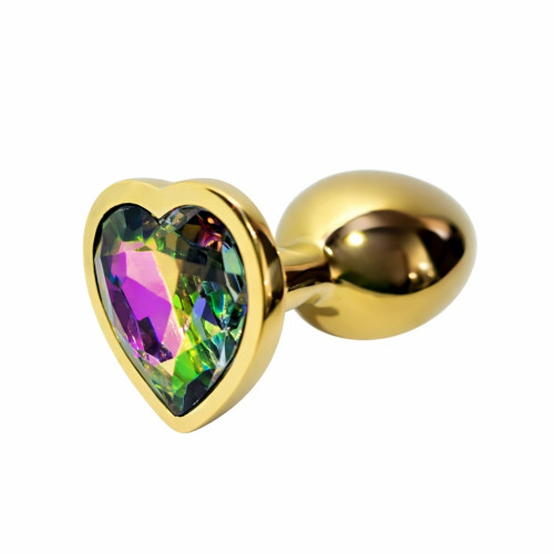 Анальная пробка ALUME, M, металлическая золотистая с разноцветным камнем в форме сердца, 8,5х3,3 см