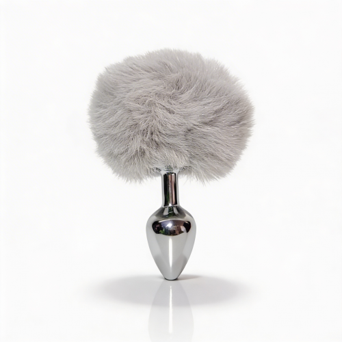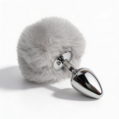 Анальная пробка небольшого размера с металлической вставной частью конической формы и заостренным кончиком. Корпус имеет глянцевую серебристую поверхность с зеркальным блеском. Форма сужается к вершине для постепенного введения. Основа выполнена как большая пушистая декоративная часть из густого серого пушка с легким блеском. Пух объемный, серого цвета, закреплен на металлическом стержне по центру. Конструкция сочетает жесткую металлическую часть и мягкую декоративную основу.