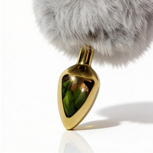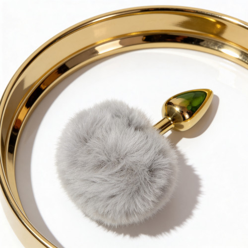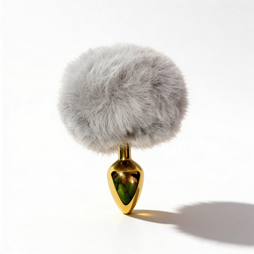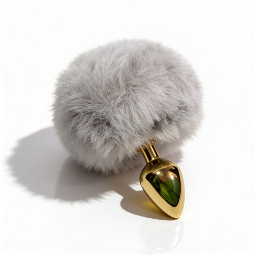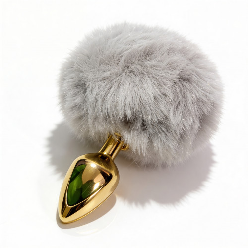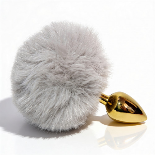 Анальная пробка небольшого размера с металлической вставной частью конической формы и заостренным кончиком. Корпус имеет глянцевую золотистую поверхность с зеркальным блеском. Форма сужается к вершине для постепенного введения. Основа выполнена как большая пушистая декоративная часть из густого серого пуха с легким блеском. Пух объемный, серый, закреплен на металлическом стержне по центру. Конструкция сочетает жесткую металлическую часть и мягкую декоративную основу.