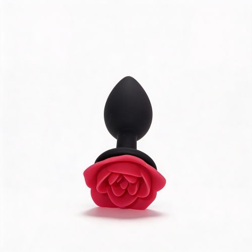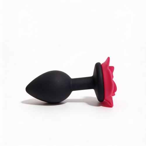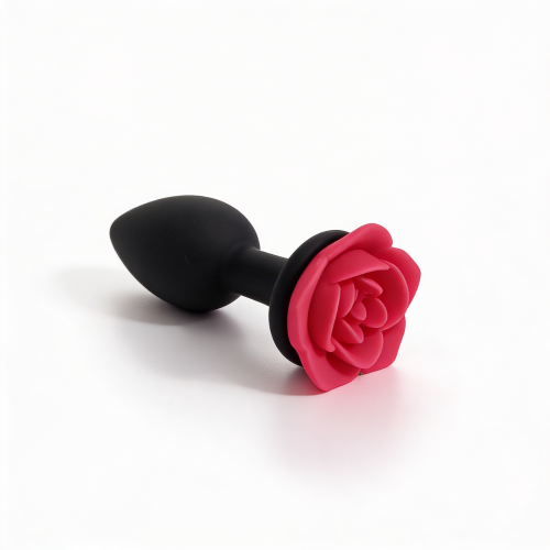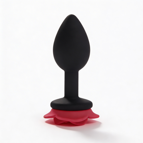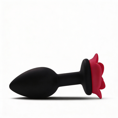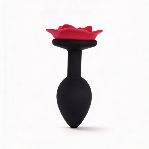 Анальная пробка небольшого размера с конусообразной каплевидной вставной частью и декоративной основой в форме раскрытой розы. Вставная часть полностью черная, матовая, с закругленным кончиком. Поверхность гладкая, без швов и текстуры. Основание выполнено в виде красной розы с выразительными лепестками и рельефом. Цветовая схема сочетает черную вставную часть и красные наружные лепестки.