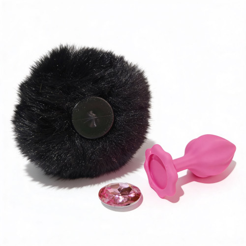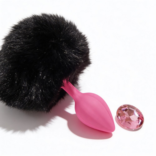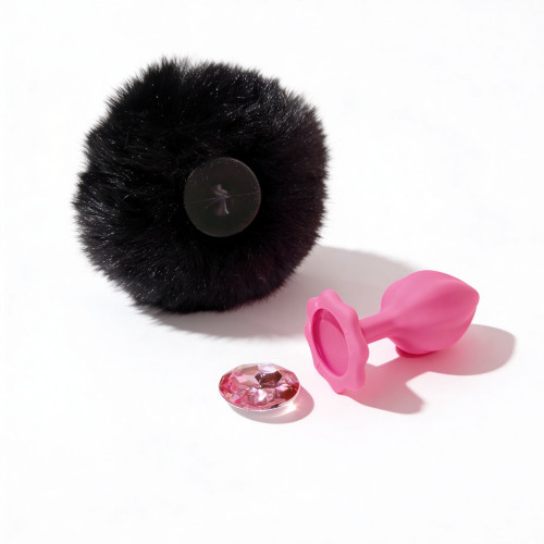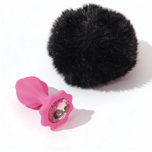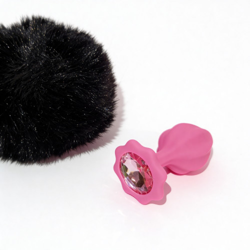 Анальная пробка рельефная ALUME S, розовая с черным пушком и съемным розовым камнем, 7 × 2,8 см