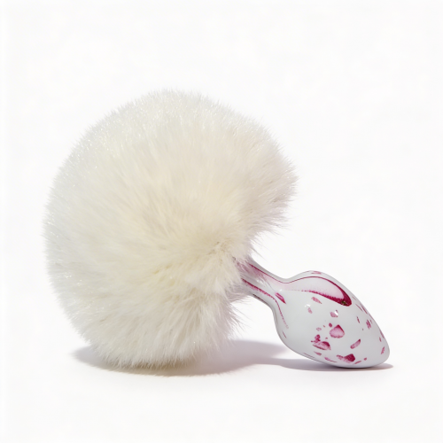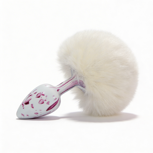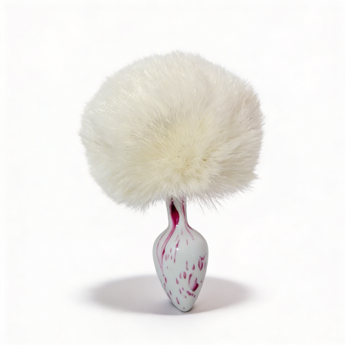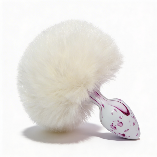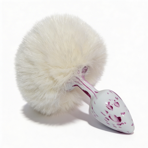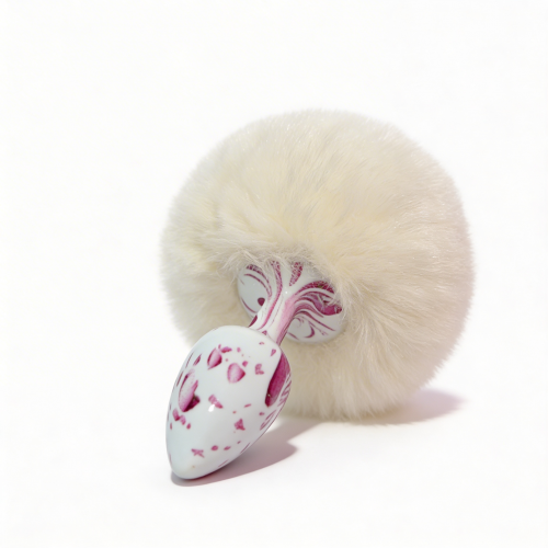 Анальная пробка небольшого размера с металлической вставной частью конической формы и заостренным кончиком. Корпус имеет глянцевую белую поверхность с декоративным узором. Конструкция сужается к вершине для постепенного введения. Основа выполнена в виде объемного белого пуха с легким блеском. Пух густой, светлый, закреплен на металлическом стержне по центру. Общий вид сочетает гладкий металлический элемент и мягкую декоративную основу.