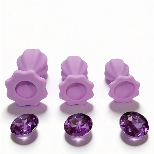 Все пробки выполнены в лиловом цвете и дополнены декоративными лиловыми камнями в основании. Камень выполняет роль удобного упора и добавляет заметный визуальный акцент. Набор подходит для вариативного использования благодаря разным размерам.