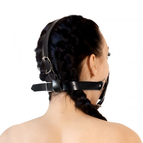 Ошейник изготовлен из натуральной кожи высокого качества с добавлением металлической фурнитуры. С помощью металлических колец, ошейник застегивается не только на шее, но и проходит через голову, для более сильной фиксации. Широкая полоска кожи надежно закрывает рот, что лишь укрепляет позицию раба, ведь он больше не способен распоряжаться собой.