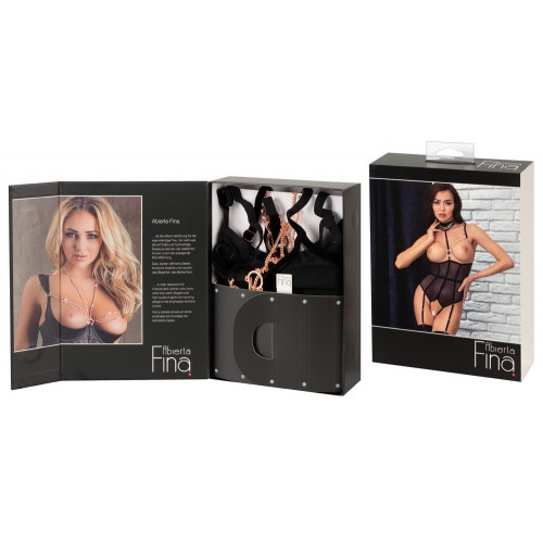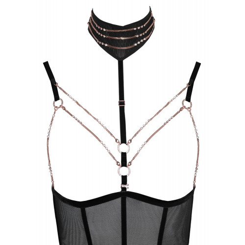 Открытая чашка, боди Powernet от Abierta Fiena с полностью открытой областью промежности, эластичными бархатными бретельками и отделкой цвета розового золота. Бретельки бюстгальтера и подтяжек можно регулировать. Ремни для подтяжек можно снять. Регулируемая бретелька на декольте и колье (с пуговицей сзади) с декоративными цепочками вокруг него. Ремешок на декольте и колье также съемные. Маленькие цепочки в области декольте с карабинами и цепочка в области промежности с декоративным кольцом также съемные. Задняя часть корпуса выполнена в виде двух частей. На бюстгальтере есть две застежки-клипсы и пояс для трусиков/чулок.
