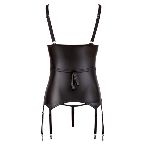 Сексуальный корсет в черном цвете. Сделан из эластичного материала с мокрым эффектом. Модель на тонких бретелях с регулируемыми подвязками для чулок. Чашки лифа открыты на косточках. Модель украшена декоративными поясками. В комплекте трусики-стринги с пикантно открытой интимной зоной.