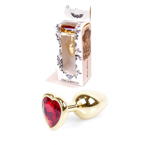 Золотиста анальна пробка з гладкою безшовною поверхнею. Створена з високоякісного металу, безпечного для здоров'я. Іграшка має зручний розмір і гладку конічну форму, яка забезпечує легке і безпечне користування. Для додаткових відчуттів, іграшку можна помістити в гарячу або холодну воду. Широка основа декорована сяючим червоним кристалом у формі серця. Довжина - 7 см, діаметр - 2,7 см.
