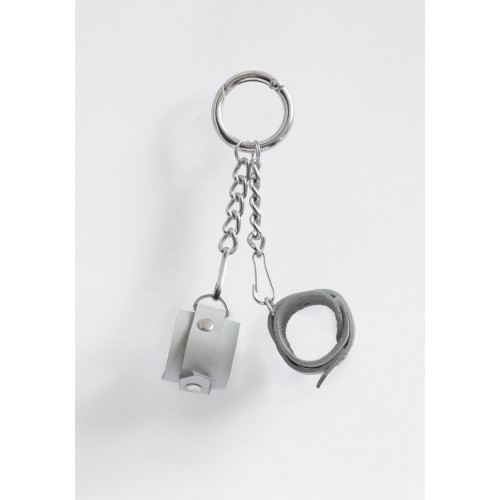 Мини-наручники из натуральной кожи растительного дубления, украшены хольнитенами (заклепками). Каждый наручник крепится к основному кольцу-карабину цепочкой и мини-карабином, поэтому можно носить только один наручник, а второй — подарить своему партнеру в качестве символа.