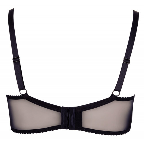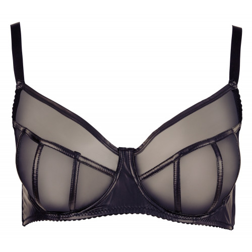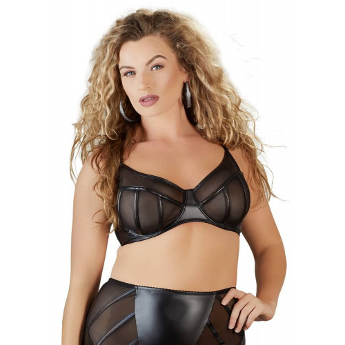 Бюстгальтер черного цвета на широких бретелях из качественного сетчатого материала, декорирован тонкими полосками из ткани с мокрым эффектом. Чашки глубокие на косточках, хорошо поддерживают большую грудь. Идеально подойдет для девушек с пышными формами.