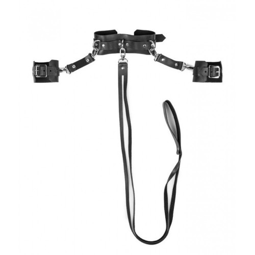 К ошейнику с помощью карабинов крепится длинный поводок с удобной ручкой, а также наручники, которые зафиксируют ваши руки в наполовину приподнятом положении.