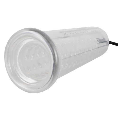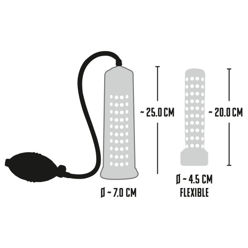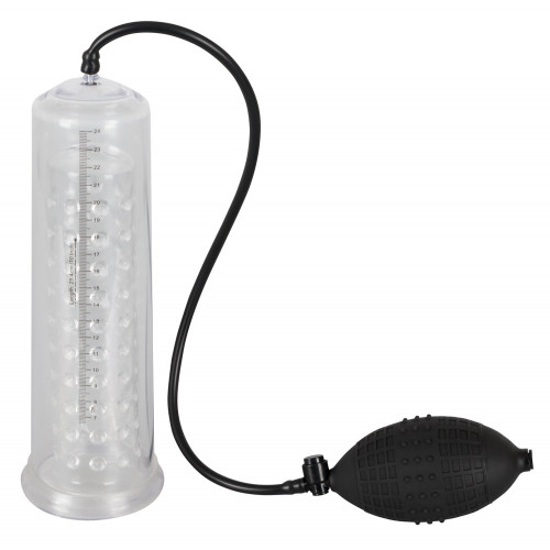 Мужская вакуумная помпа, состоит из прозрачной колбы с измерительной шкалой и мягким текстурированным уплотнителем, удобной груши с клапаном регулировки давления и гибкого шланга для откачки воздуха. Помпа существенно улучшает кровообращение, что положительно сказывается на качестве эрекции. При длительном использовании заметно увеличивает размер полового органа. Длина помпы - 25 см, диаметр - 7 см.