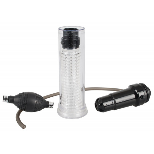 Уникальный вакуумный мастурбатор-помпа для мужчин. В комплекте: рукав для пениса с ребристым внутренним рельефом, колба со шлангом и грушей для создания вакуума и встроенные виброэлементы.