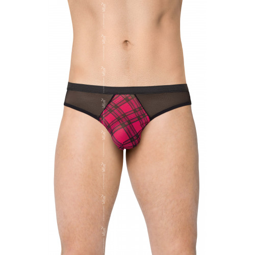 Мужские трусы-стринги. Сшитые из полупрозрачной эластичной сетки, передняя деталь выполнена из плотной ткани в клеточку розового цвета. Можно использовать как для сексуальных игр, так и для повседневной носки.