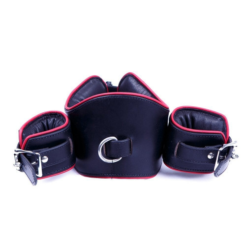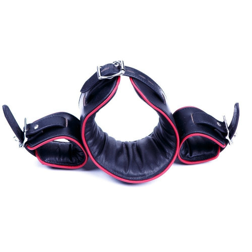 Ошейник анатомический с наручниками DS Fetish черный с красной строчкой (Голландия)