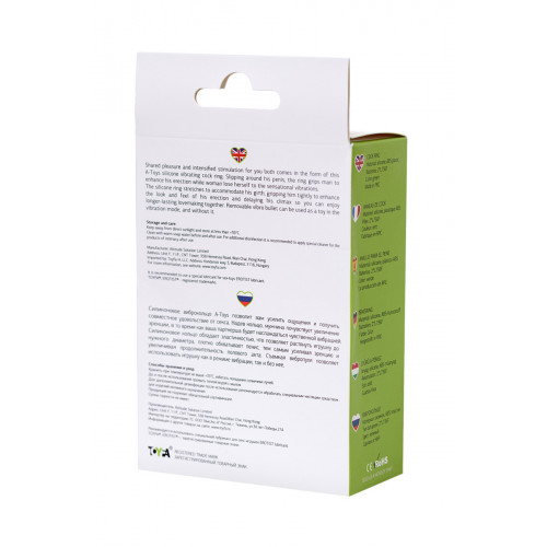 Силиконовое віброкільце A-toys by TOYFA позволит вам усилить ощущения и получить совместное удовольствие от секса. Надев кольцо, мужчина почувствует увеличение эрекции, в то время как ваша партнерша будет наслаждаться чувственной вибрацией. Силиконовое кольцо обладает эластичностью, что позволяет растянуть игрушку до нужного диаметра, плотно охватывает пенис, тем самым усиливая эрекцию и увеличивая продолжительность полового акта. Съемная вібропуля позволяет использовать игрушку как в режиме вибрации, так и без нее.