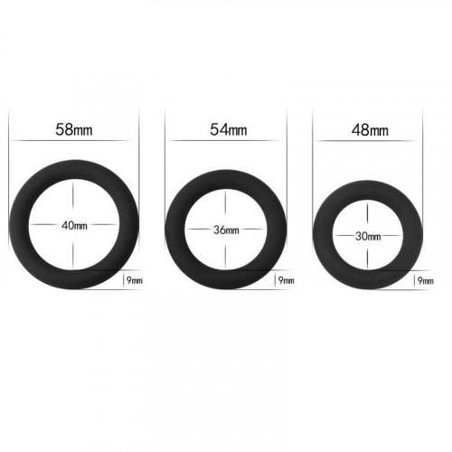 Набор из трех гладких эрекционных колец черного цвета. Изготовлены из эластичного силикона высокого качества. Кольца легко одеваются на пенис и препятствуют оттоку крови, чем делают эрекцию более сильной и длительной. Можно использовать все вместе, или по отдельности. Диаметр - 5,8 см, 5,4 см и 4,8 см.