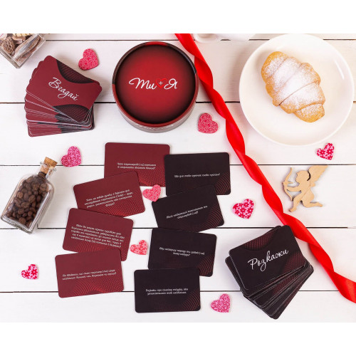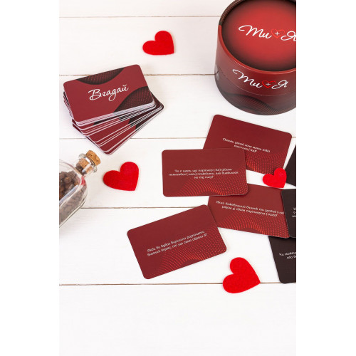 Опис: «Ти + Я» - гра, яка не тільки зможе розважити вас, але і стане справжнім сімейним психологом для ваших стосунків. Відповідаючи на небанальні та іноді несподівані питання, ви будете дізнаватися щось нове про свого партнера і про самого себе. Гра допоможе зробити ваші стосунки більш розкутішими, знайти нові теми для обговорення, підштовхнути до цікавої розмови.