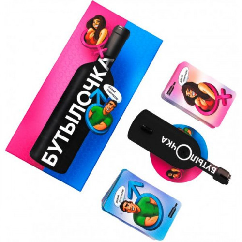 Комплектация: 100 карт задач для него и для нее, 12 скип-жетонов, 1 стрелка-бутылка, правила игры