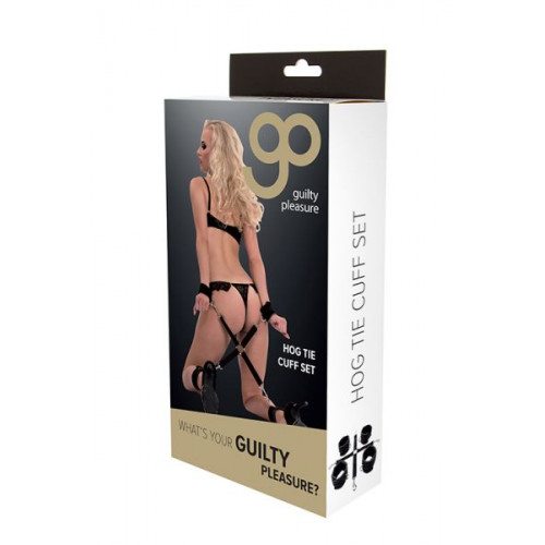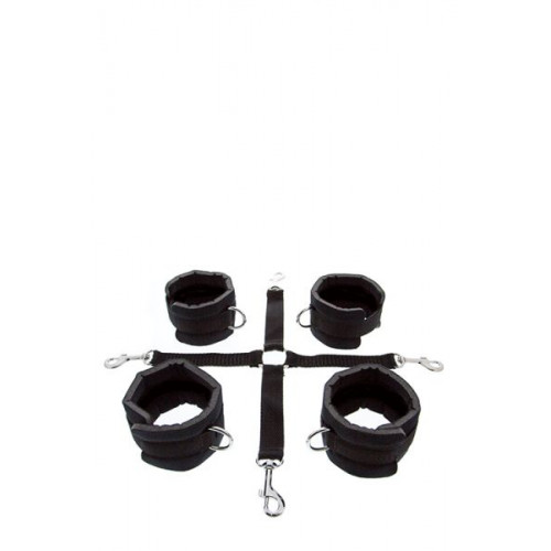 Hog tie kit with wrists and ankle cuffs. The cuffs are made of soft foam material for extra comfort and can be easily adjusted with the velcro closure or released with the metal snap clips.