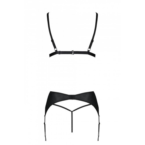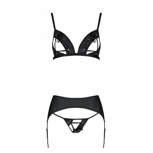 Комплект из эко-кожи: трусики и бюстгальтер с вырезами, пояс для чулок Miley Set with Open Bra black L/XL — Passion: