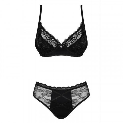 Бренды: Obsessive Комплект состоит из бюстгальтера и трусиков в тон. Сочетание цветочного кружева и черной атласной ткани. Регулируемые бретели обеспечивают идеальную посадку. Чашки на косточках: идеальны для большой груди. Атласный бантик между грудями. Материал нежный на ощупь и идеально эластичный. Состав: 90 % полиамид, 10 % спандекс.