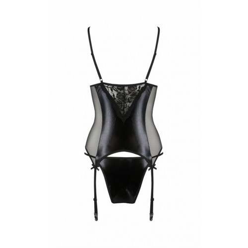Классический крой корсета сочетается с нежным кружевом и волнующим материалом, имитирующим кожу. Крой корсета подчеркивает талию и приподнимает бюст, создавая красивый и стройный силуэт. Подвязки позволяют дополнить образ чулками (в комплекте не идут). Трусики в комплекте.