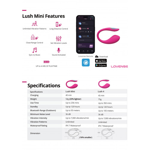 Lush Mini — компактный и современный вибратор, разработанный для точечной стимуляции точки G благодаря мощной глубокой вибрации (7000 колебаний в минуту) и передовым технологиям. Эргономичная форма обеспечивает точное ощущение удовольствия, а ультратихий мотор позволяет использовать устройство незаметно даже в общественных местах. Дизайн Lush Mini подходит для разных форм и размеров, сочетая комфорт и эффективность.