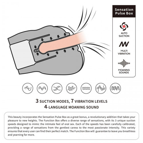 Особенностью модели является инновационный модуль Sensation Pulse Box, обеспечивающий сразу несколько типов стимуляции. Он оснащен тремя режимами вакуумного всасывания, имитирующими эффект орального секса — от нежных пульсаций до интенсивных ритмичных волн.