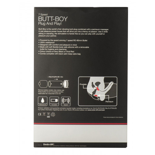Butt Boy от Rocks Off по форме очень сильно отличается от других массажеров простаты. Благодаря своей конической форме он сочетает в себе свойства массажера предстательной железы и анальной пробки. Поэтому Butt Boy можно использовать не только в сидячем и лежачем положении, а также и стоя!!! Вставив Butt Boy до упора - вибрирующая часть прижмется вплотную к вашей промежности, а рабочая часть массажера будет надежно держаться внутри.