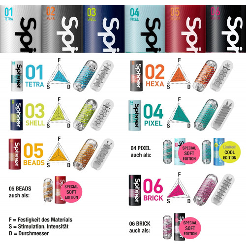 Новая технология — спиральный механизм Go for a Spin" — это то, что способно удивить даже знатоков Tenga. Внутри у Spinner все тот же материал от Tenga с богатым рельефом. Чем интенсивней и быстрей вы будете двигать мастурбатор, тем сильнее он будет закручиваться, приводя вас на вершины блаженства.