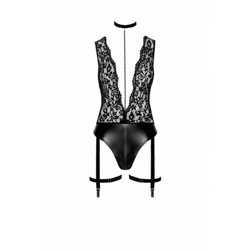 Боди Noir Handmade F297 Libido Deep-V bodysuit with collar, pearl chain and garter - M
