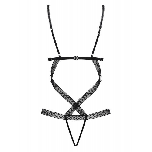 Це сексуальне боді створене для сміливих і яскравих образів. Модель поєднує в собі бюстгальтер і трусики з відкритою інтимною зоною. Тонкі ремінці з геометричним візерунком красиво облягають тіло, підкреслюючи силует. М’які трикутні чашки з вертикальними швами підкреслюють груди. Регульовані бретелі та застібка дозволяють точно підігнати боді по фігурі. Декоративні елементи на грудях і стегнах додають звабливості, а блискучі деталі – особливого характеру. Матеріал м’який, еластичний і приємний до тіла.