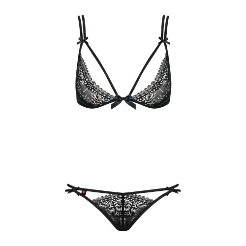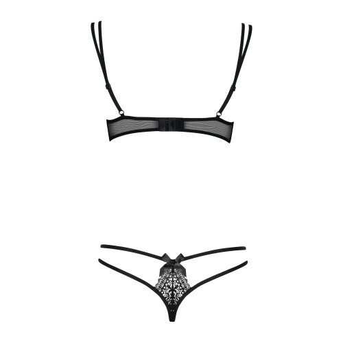 Цей комплект створений для особливих моментів. Мереживний бюстгальтер з додатковими ремінцями гарно підкреслює груди. Подвійні бретелі, що перехрещуються на спині, додають ефектного вигляду. Спереду – маленький бантик для ніжного акценту. Трусики-стрінги мають подвійні ремінці з боків і бантики спереду та над сідницями. Матеріал еластичний і приємний до тіла.