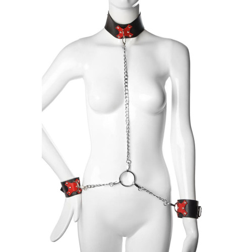Наручники изготовлены под стиль ошейника и подсоединяются цепочками к центральному кольцу, соединяющему три цепи.