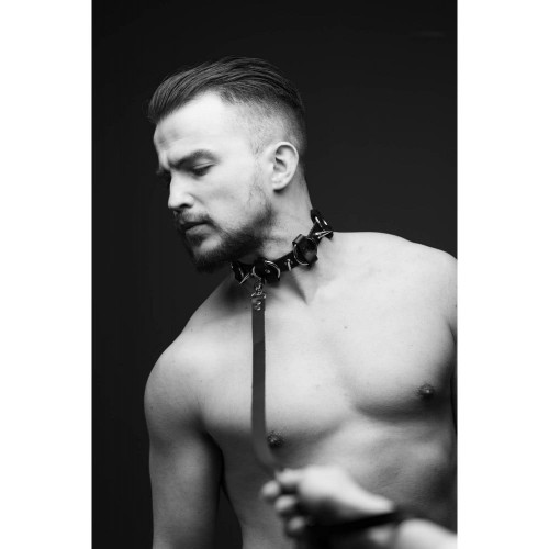 Ошейник с поводком, с кольцами и шипами M-Ch3.1 натуральная кожа, мужской, черный