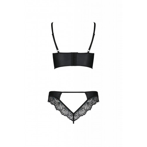 Этот элегантный комплект, состоящий из бюстгальтера и стрингов, сочетает в себе матовую искусственную кожу с изысканным кружевом, создавая неповторимый образ соблазна и роскоши.