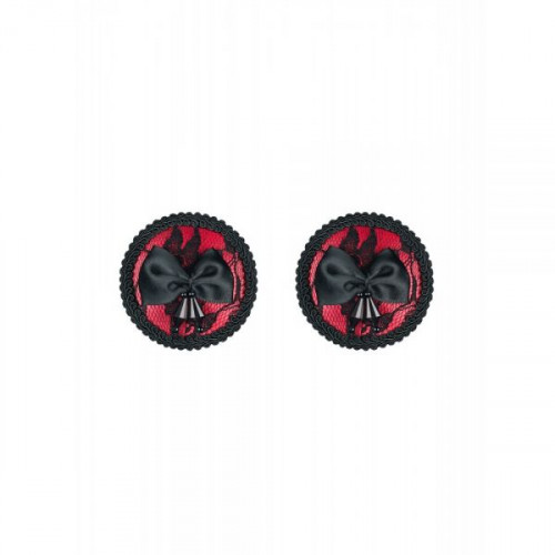 Вы уже подготовили свой сексуальный образ на вечер? Вам осталось добавить всего лишь маленькую деталь— пэстисы на соски! Незаменимый аксессуар для соблазнения, который разбавит любой образ эротичными и пикантными нотками! Пэстисы выполнены из атласной ткани и гипюра, украшенных игривыми черными бантиками и тесьмой по кругу. Контраст черного и красного цвета делают пэстисы невероятно заметной деталь образа.