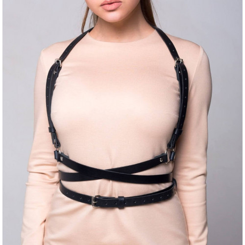 Это классическая портупея со стильными деталями не зря занимает лидирующие позиции на рынке. Уникальный дизайн объединяет в себе традиционную конструкцию вертикальных лямок и авангардный стиль диагональных и горизонтальных ремешков. Геометрическая конструкция визуально стройнит, а перекрещивающиеся ремни создают эффект более тонкой талии.