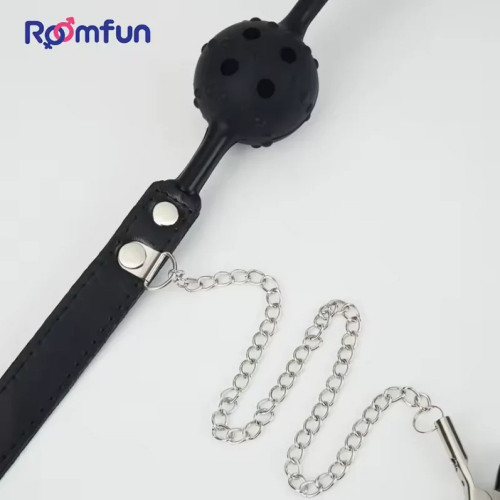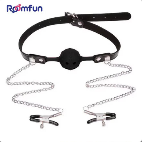 Кляп-шарик с отверстиями Roomfun и зажимами для сосков, черный