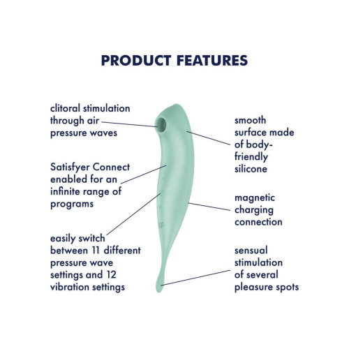 Twirling Pro — это гибридный вибратор с двумя зонами стимуляции. Один конец обеспечивает воздушно-волновую стимуляцию клитора, другой — точечную вибрацию любой эрогенной зоны с помощью вращающегося наконечника. Устройство оснащено двумя независимыми моторами и поддерживает управление через мобильное приложение (iOS/Android). Вы можете выбрать один из 12 режимов вибрации или настроить одну из 11 интенсивностей воздушного давления в зависимости от выбранной стороны.