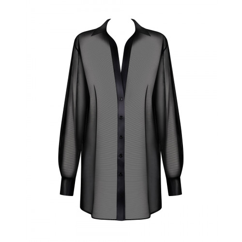 Черная длинная рубашка из слегка полупрозрачного материала. Атласные вставки на манжетах, воротнике и по телу станут элегантным элементом в целом. Сексуальные разрезы на бедрах добавят сексапильности и подчеркнут ноги. Свободный крой оверсайз станет удобным решением и в повседневном стиле. Воздушный крой позволит не ограничивать движения.