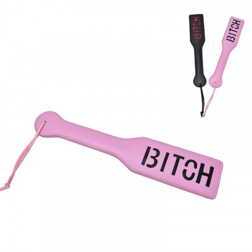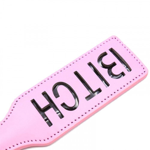 Розовая двойная шлепалка из искусственной кожи и с перфорацией слова "Bitch".