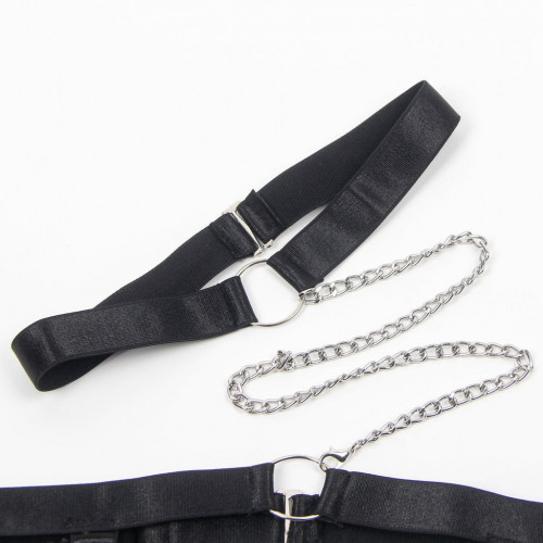 Четыре широкие подвязки с металлическими пряжками надёжно фиксируют чулки и придают образу роскоши. Цепочки с наручниками и ошейником — съёмные, что позволяет адаптировать образ под ваше настроение.