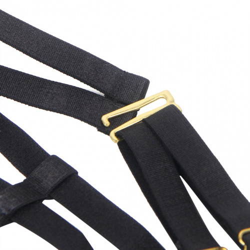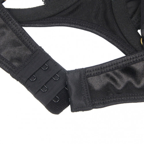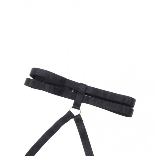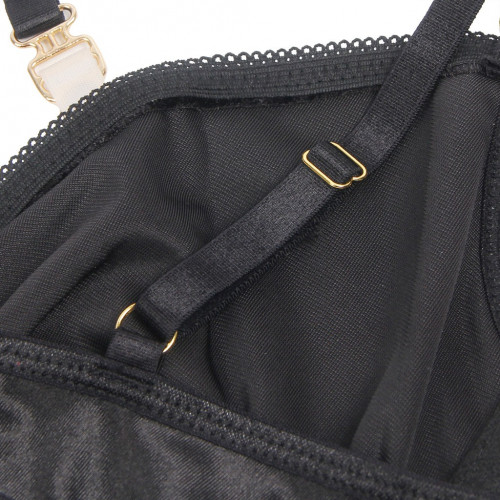 Два эластичных ремешка, соединяющие шлейку с чашечками, создают эффектный акцент в зоне декольте. Металлические пряжки придают комплекту современный и стильный вид.