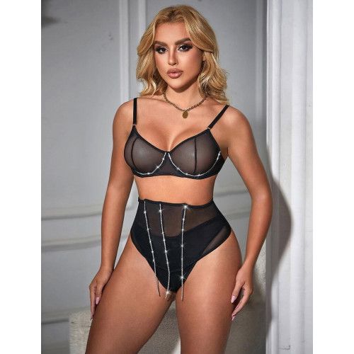Сексуальный черный комплект белья Star Night с декоративными стразами и цепочками, M