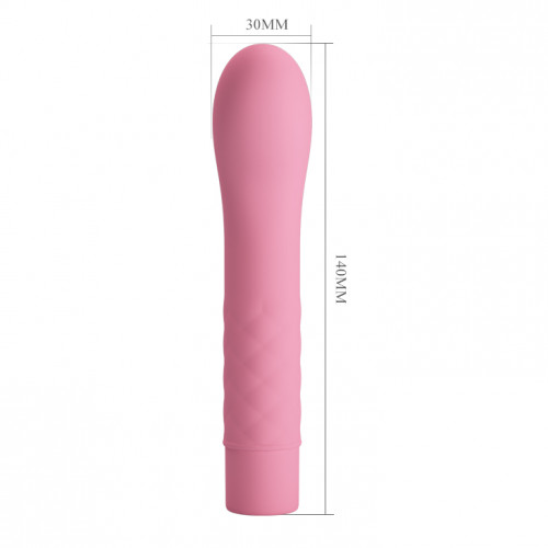 Водонепроницаемый вибратор нежно-розового цвета. Сделан из гипоаллергенного бархатистого силикона высокого качества. Имеет гладкую загнутую головку для массажа точки "G" и ненавязчивый геометрический рельеф на стволе. 10 режимами вибрации легко управлять в основании изделия. Длина - 14 см, диаметр - 3 см.