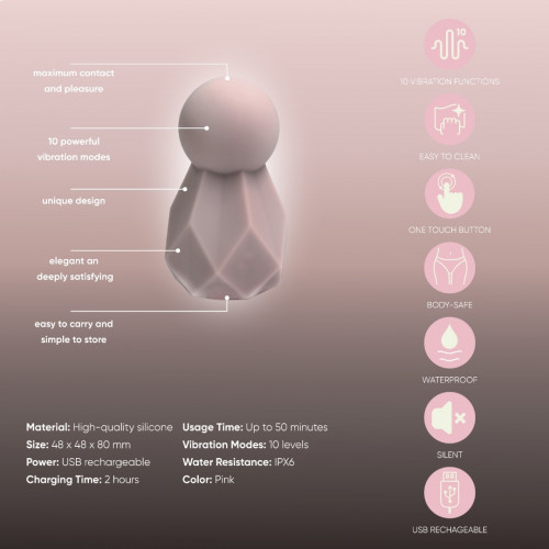 Грани и округлая головка создают волшебное сочетание ощущений, доставляя невероятное удовольствие. Закройте глаза и представьте, как его мягкие прикосновнеия ласкают ваш клитор, а округлая головка нежно прижимается к нему, создавая настоящий рай. Этот нереалистичный вибратор для клитора способен удовлетворить даже самые смелые фантазии. Он обладает 10 режимами вибрации, которые позволят вам настроиться на желаемый ритм и интенсивность стимуляции. Почувствуйте, как каждая вибрация проникает глубоко в ваше тело, разжигая огонь страсти.