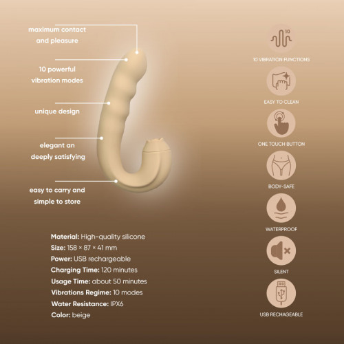 Особенностью модели является встроенный язычок для клиторальной стимуляции, который имитирует оральные движения. Несколько режимов вибрации позволяют варьировать интенсивность ощущений, подстраивая процесс под личные предпочтения. Бежевый цвет придаёт устройству элегантность и делает его незаметным, а компактный размер позволяет хранить его незаметно или брать с собой в поездки.