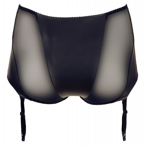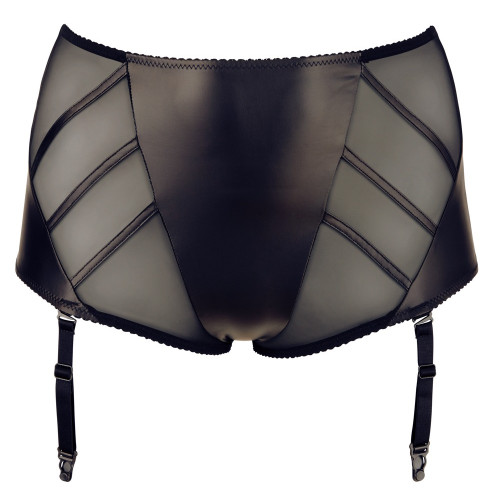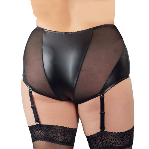 Чорні трусики з високою посадкою і знімними підв'язками для панчіх. Виготовлені з еластичної тканини з мокрим ефектом. Модель декорована вставками з сітчастого матеріалу. Трусики відмінно виглядають і приховують недоліки фігури.